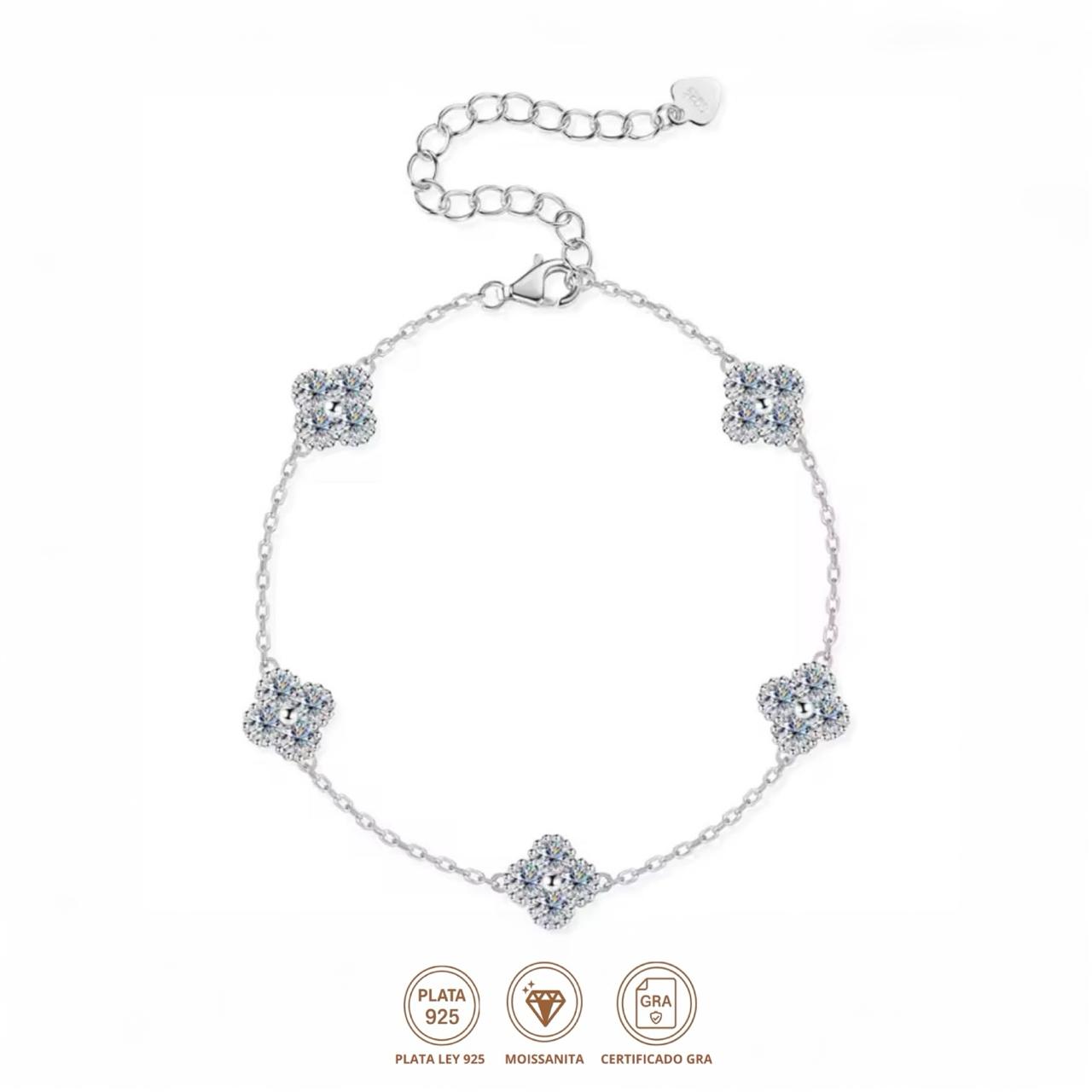 Pulsera tipo van cleef en Plata Ley 925. Está adornada con deslumbrantes piedras de moissanita que aportan un toque de luz y elegancia. Su diseño ajustable permite un calce perfecto para cualquier muñeca, haciendo de esta pieza una joya versátil y encantadora.